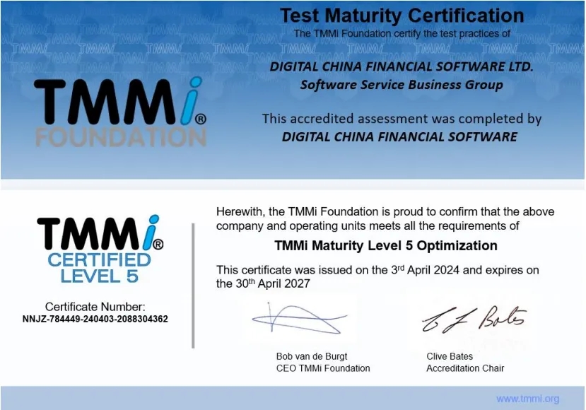 近日,神州信息子公司——融信软件有限公司(下文简称“融信”)通过TMMi(测试能力成熟度模型集成)最高级别5级国际权威认证,成为国内同时获得TMMi5级认证和CMMI5级认证的企业,覆盖咨询、产品需求、软件开发、测试、运维全流程的IT软件研发及服务。